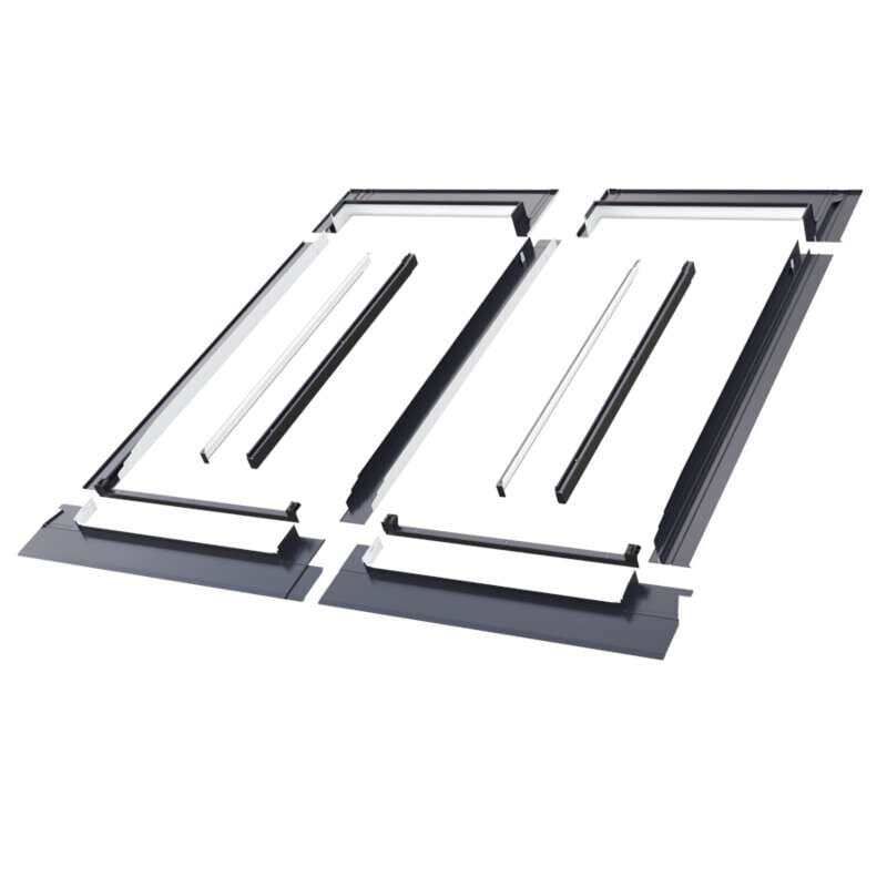 Kołnierz ESV AX21 do pokryć płaskich. Komplet do zespolenia okien w konfiguracji B2/1 ( 2 okna obok siebie ) przeznaczony do okien z lini GREENVIEW. W kolorze RAL 7016 antracyt. Standardowa szerokość rynienki zesplającej = 10 cm Fartuch aluminiowy