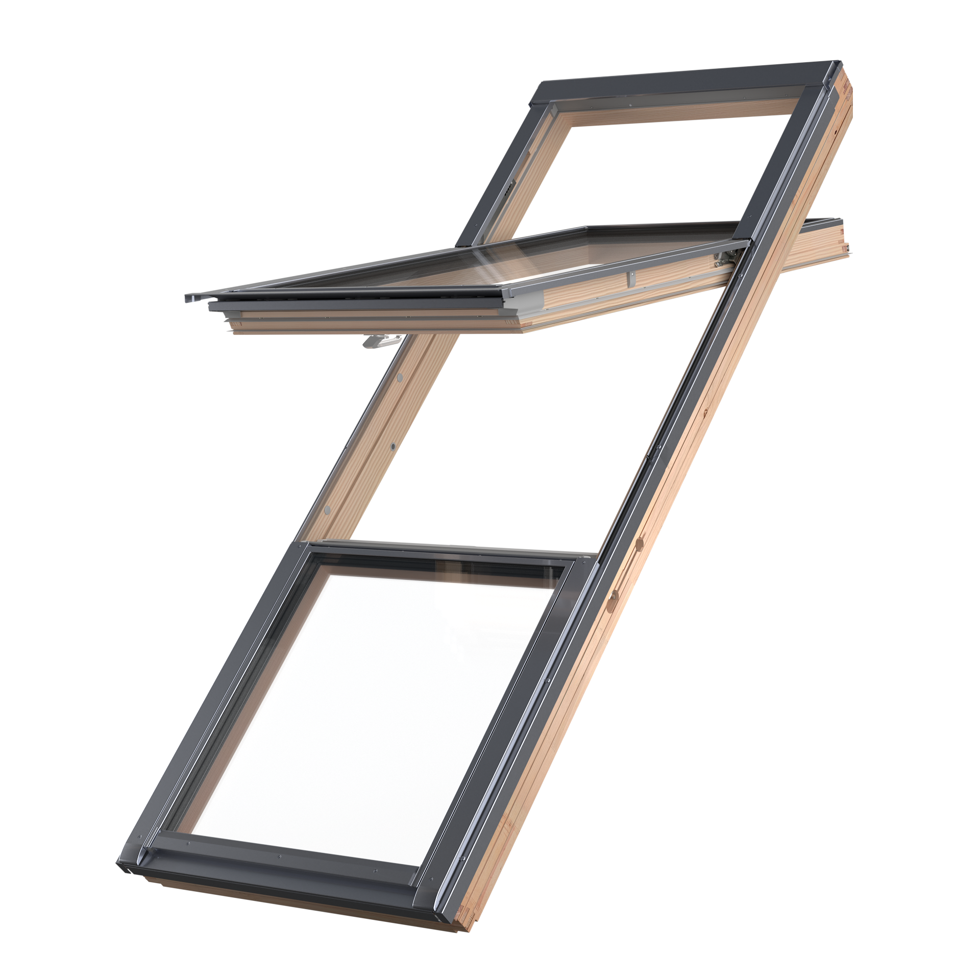 OKNA FAKRO O PODWYŻSZONEJ OSI OBROTU Z NAŚWIETLEM DOLNYM FDP-X P50 APMX GREENVIEW bez nawiewnika. Kolor oblachowania RAL 7016 antracyt.
